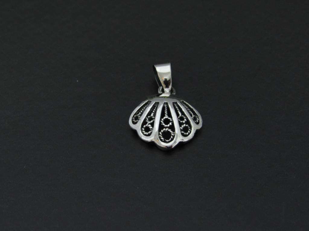 Colgante de vieira, trabajada con elmetodo tradicional de los orfebres de Santiago de compostelaen plata de primera ley