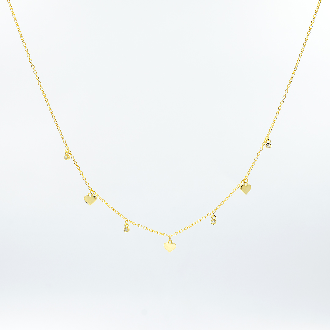 Collar de corazones y circonitas colgando, con un largo de 38 + 5 en plata con un baño de oro