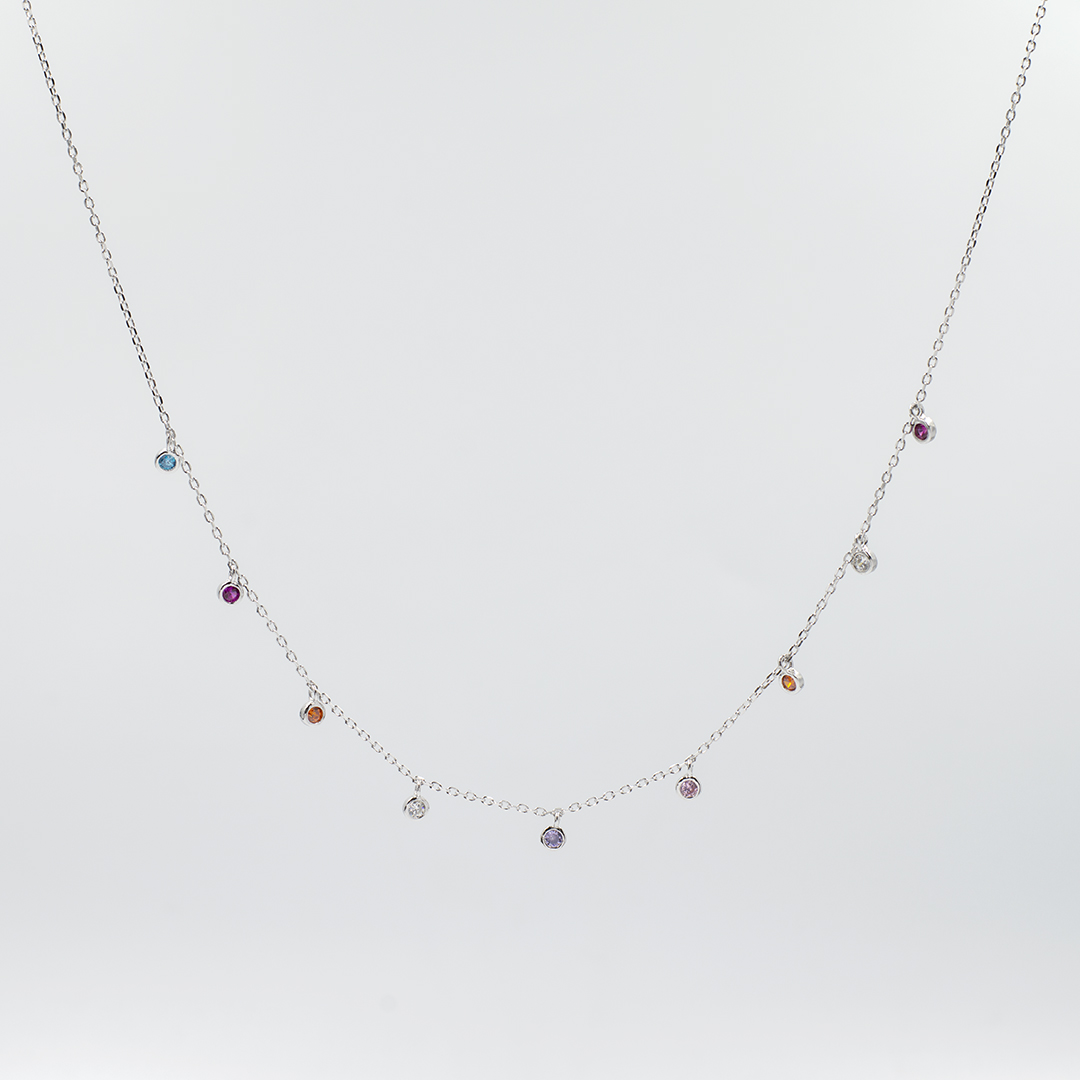 Collar con circonitas colgando con los colores del chacra de 40 + 5 cm en plata de ley
